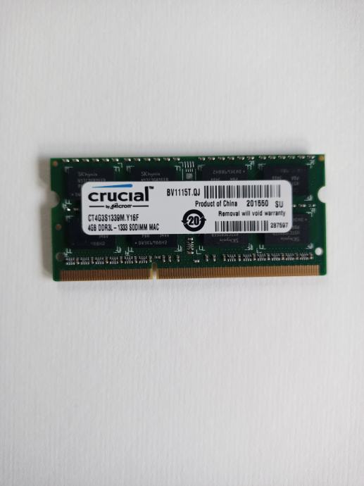 Prodam RAM pomnilnik za prenosnik znamke Crucial (Micron), 4GB DDR3L-1333 SODIMM MAC, CT4G3S1339M.Y16F.