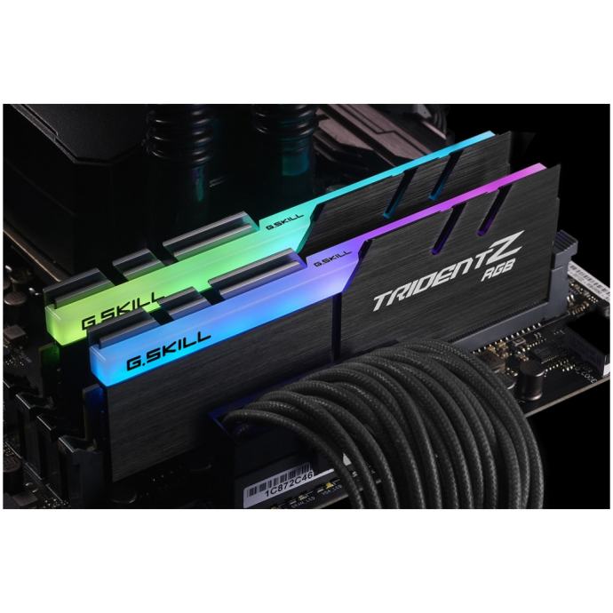 G.Skill Trident Z RGB 16GB DDR4. Komponente za: osebni računalnik / strežnik, pomnilnik RAM: 16 GB, razporeditev pomnilnika (moduli x velikost): 2 x 8 GB, vrsta notranjega pomnilnika: DDR4, hitrost pomnilnika: 3200 MHz, faktor oblike pomnilnika: 288-pinski DIMM, latenca CAS : 16, barva proizvoda: črna