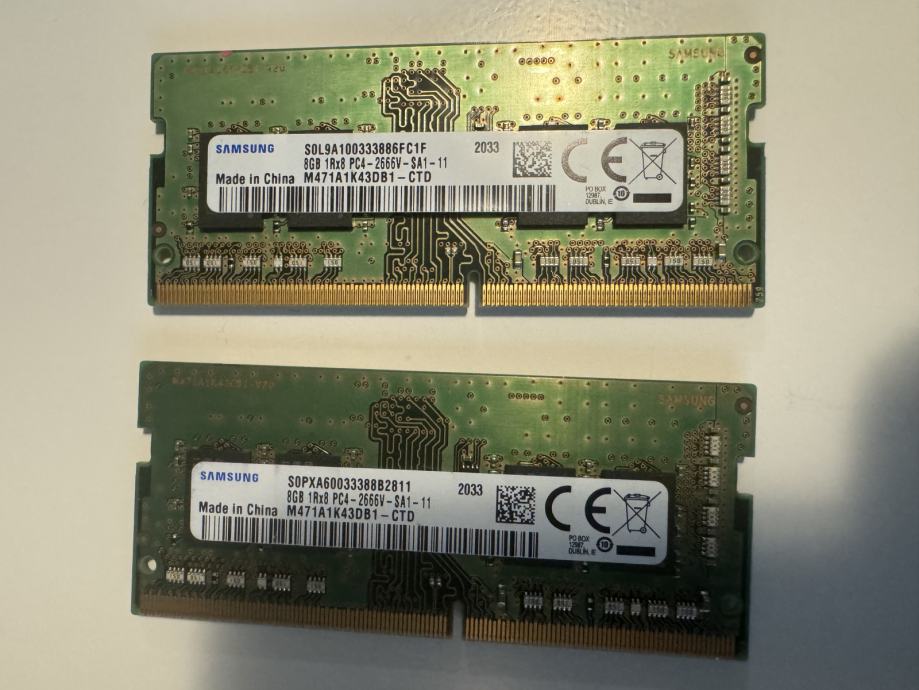 Prodam 2x Samsung M471A1K43DB1-CTD 8GB, DDR4, 2666MHz RAM/pomnilnik za prenosne računalnike (SODIMM). Razlog je nadgradnja RAMa v prenosniku. Obe komponenti delujeta brezhibno.