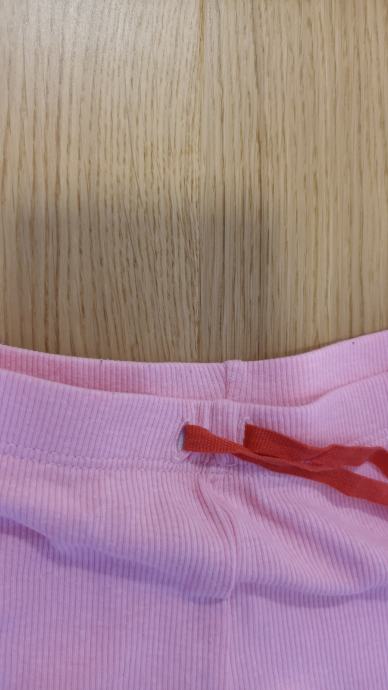 Bombažna dekliška pižama. Zgornji del ima ljubke volančkaste kratke rokave, je črtast, belo-roza, z majhnim motivom jabolka. Spodnji del so roza kratke hlače iz rebrastega materiala, z elastiko v pasu, enobarvne, s kontrastno obrobo na zaključkih hlačnic in trakom za zavezovanje, ki pa je zgolj dekorativni element.