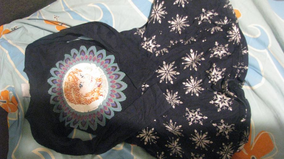 Temnomodra bozicno-novoletna oblekica z dolgimi rokavi-jesensko-zimska, bombazna z luskastim motivom gor-dol, ki spreminja motiv iz Elze v Ano....sprememba motiva vidna na slikah. Cena 18ev