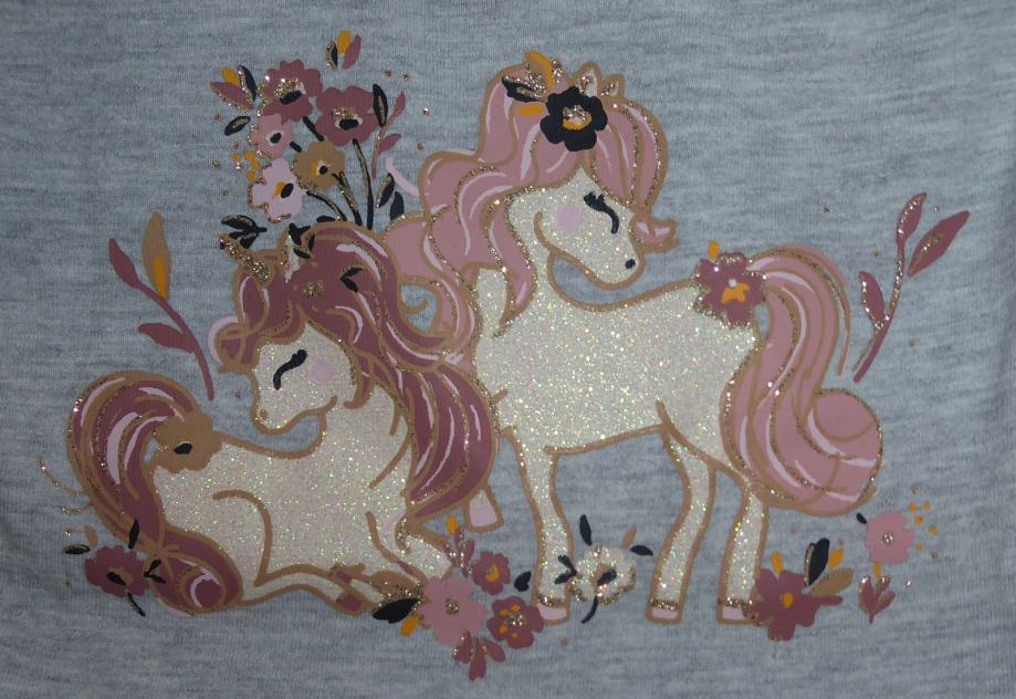 Siva oblekica z bleščičastimi konji in rožicami. Lepo se vrti. Cena posebej 5€
