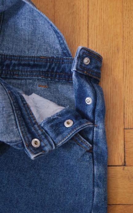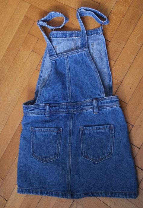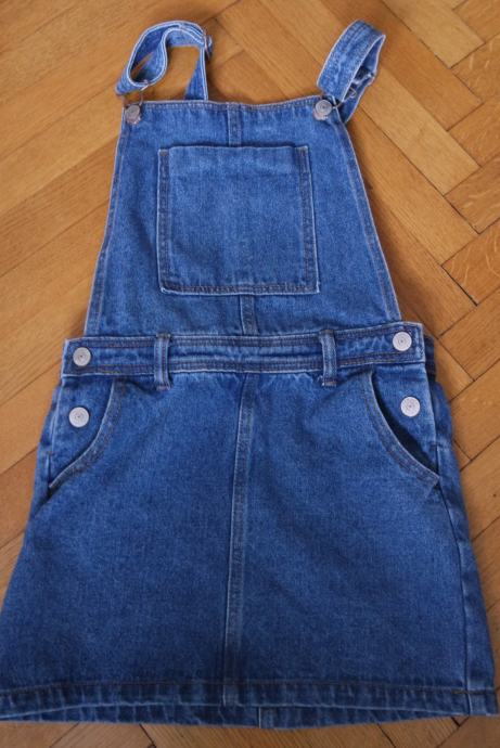 Kratka kavbojska obleka z naramnicami, z velikim žepom na prsnem delu in s po dvema žepoma na straneh, iz klasičnega džinsa. Super paše na žabe in majico, lepo ohranjena, kot nova.