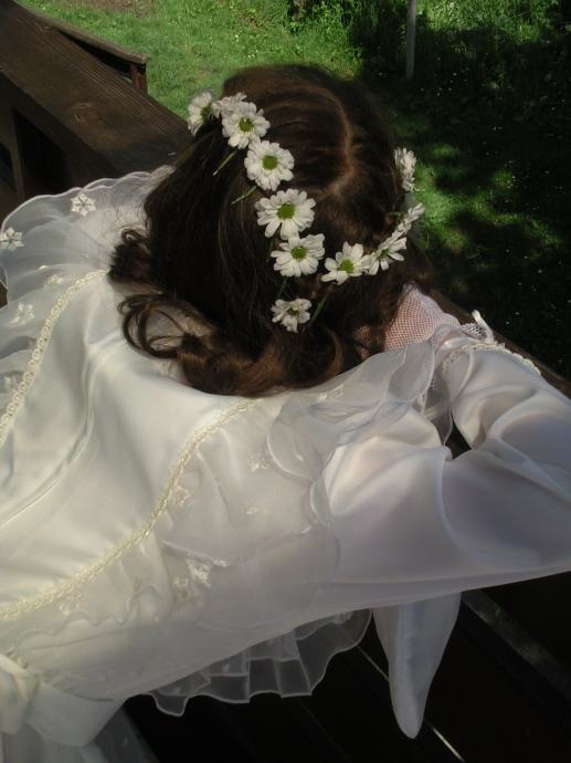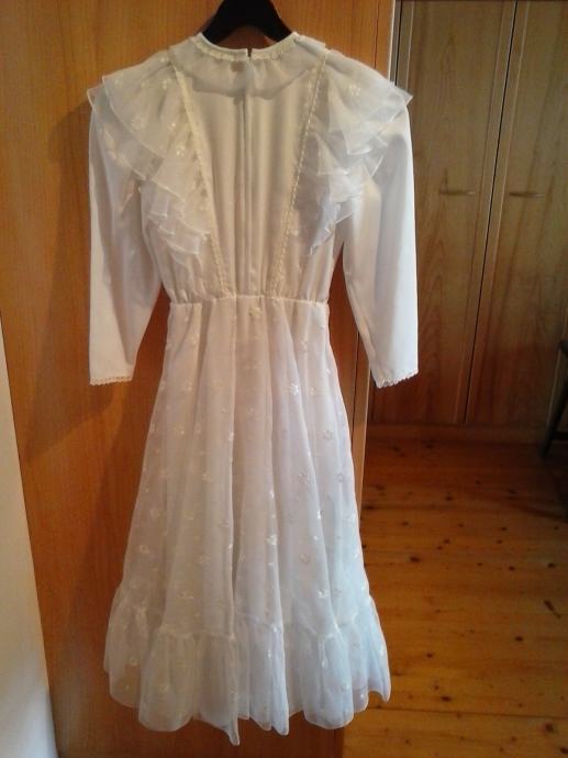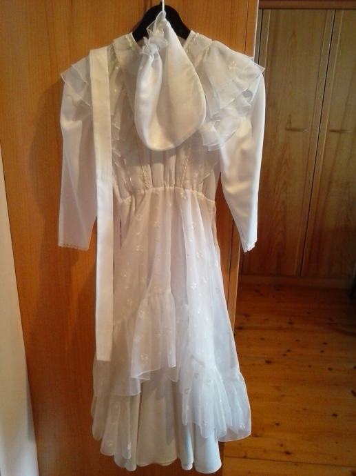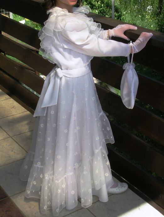 Prodam zelo lepo krojeno dekliško obleko za prvo obhajilo ali drugo svečano priložnost z lepimi detajli in prilagojeno dekliški postavi v velikosti 122/7-8 let. Obleka ima tanjše dolge rokave, zato dodaten bolero ni potreben. V komplet je vključen bel mošnjiček.
