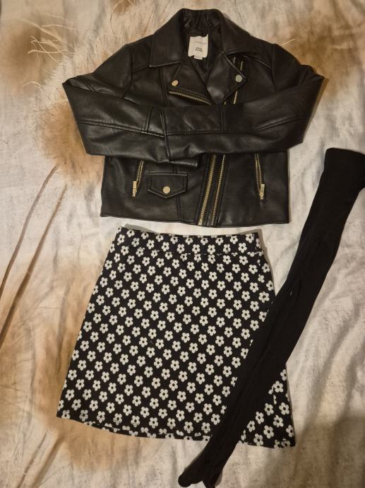 Črn komplet krilo 146/152 + žabice H&M, jakna v videzu usnja River Island (sicer številka 140, vendar nosljivo do 146+, kompletek smo nosili skupaj),cena kompleta 18 eur+ptt
