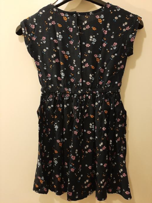 2x oblečena temno modra obleka z rožicami. Je iz viskoze in zelo lepo stoji, je bolj elegantna. Spredaj ima dva žepa, v pasu je rahla lastika. Hrbtna dolžina: 60 cm.