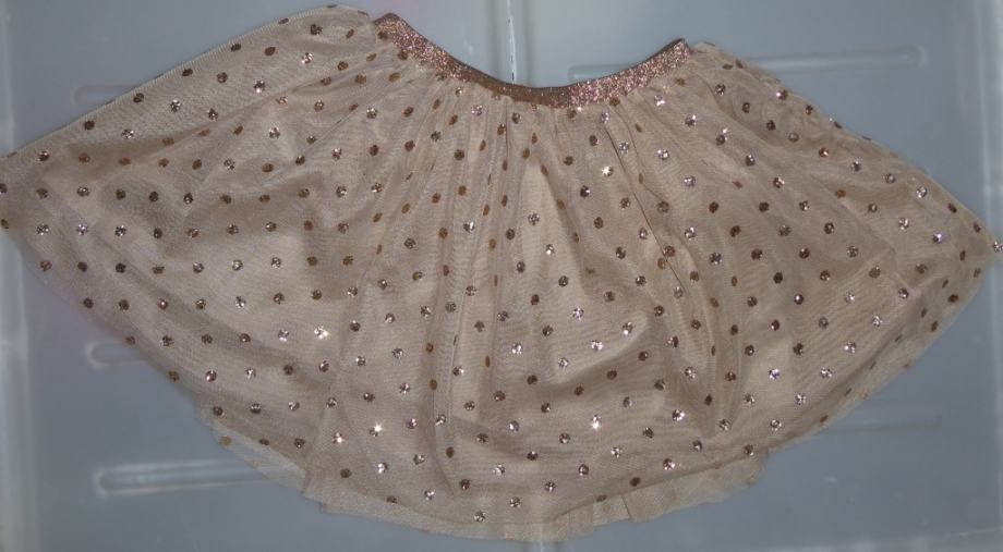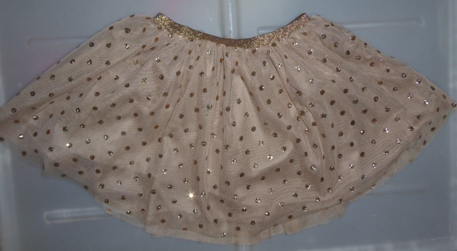 Brezhibno, kot novo tutu krilce za deklico v "zlati" barvi z zlatimi pikicami. Lep, svetleč, raztegljiv pas. Se lepo vrti. Zelo lepo. Krilce je tri-slojno. Čudovito.