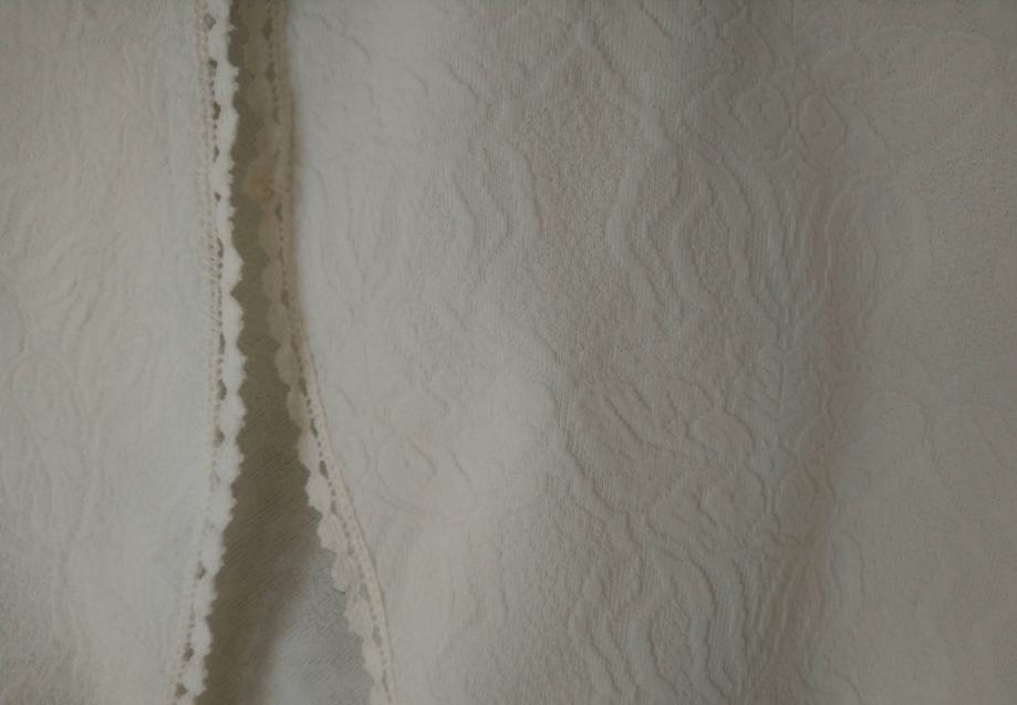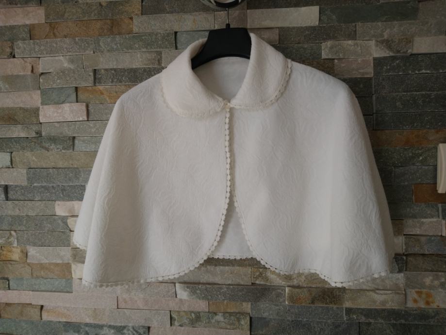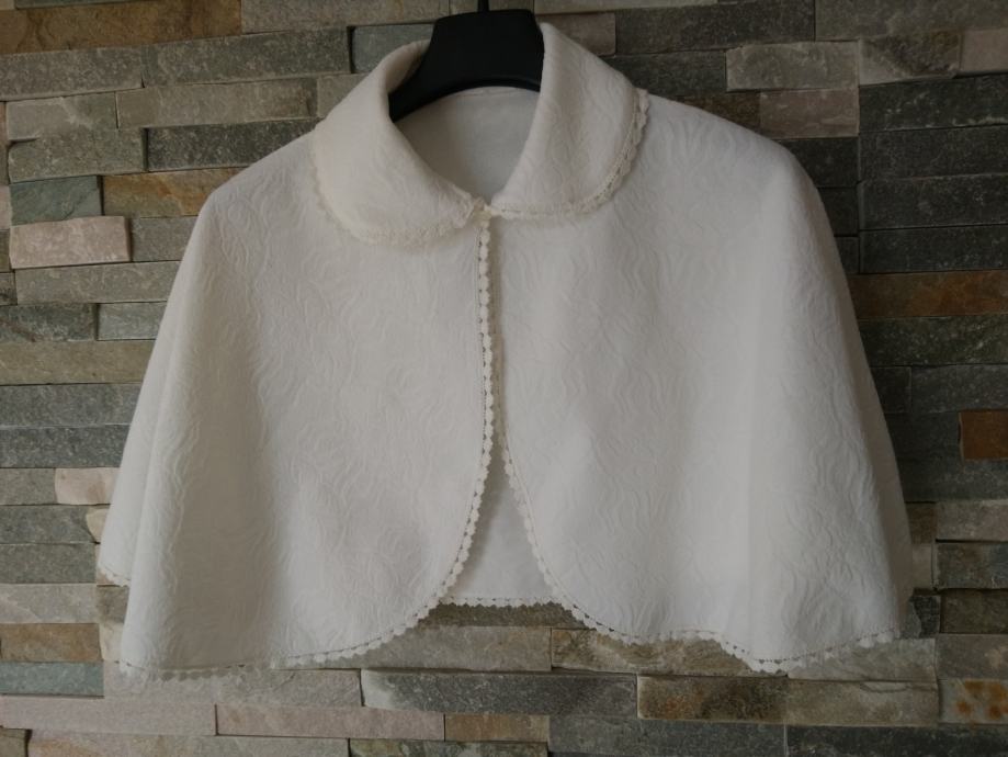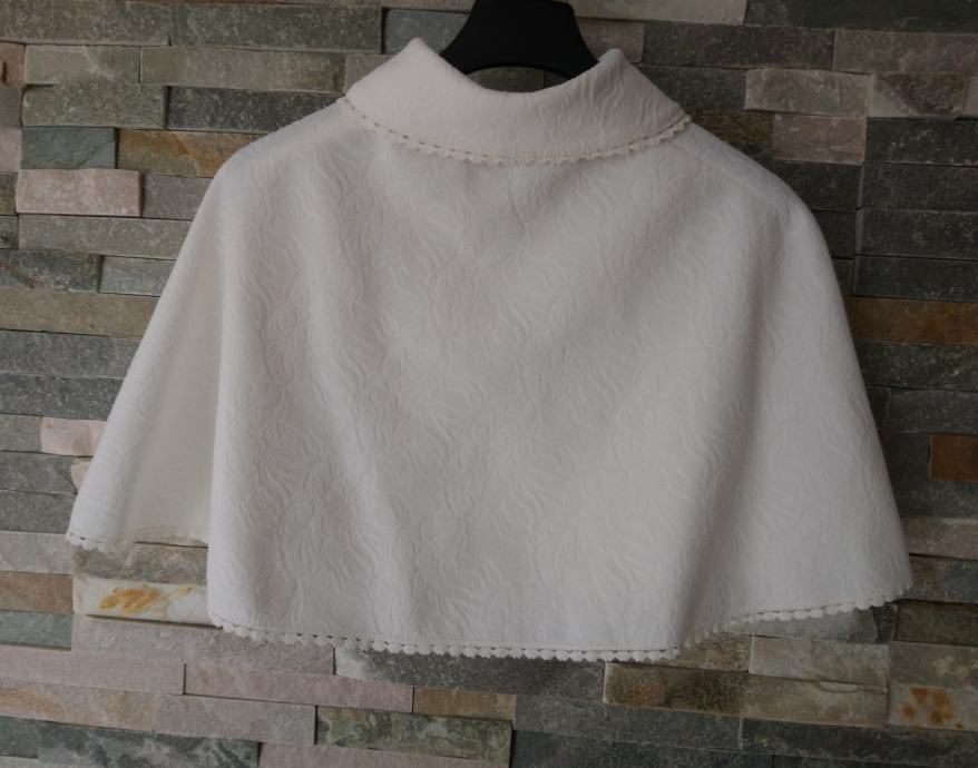 Bela otroška pelerina, domače izdelave. Obrobljena je z čipko. Zapira se na majhen gumbek. Dolžina je 34 cm.