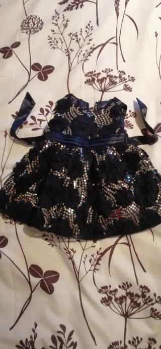 Prodam zelo lepo elegantno oblekico temno modre barve za 12m za punčko. Oblekica zelo lepo stoji, ker ima več slojev podloge, zadaj je zadrgica in trakca za zavezat pentljico.