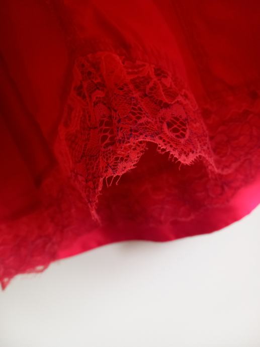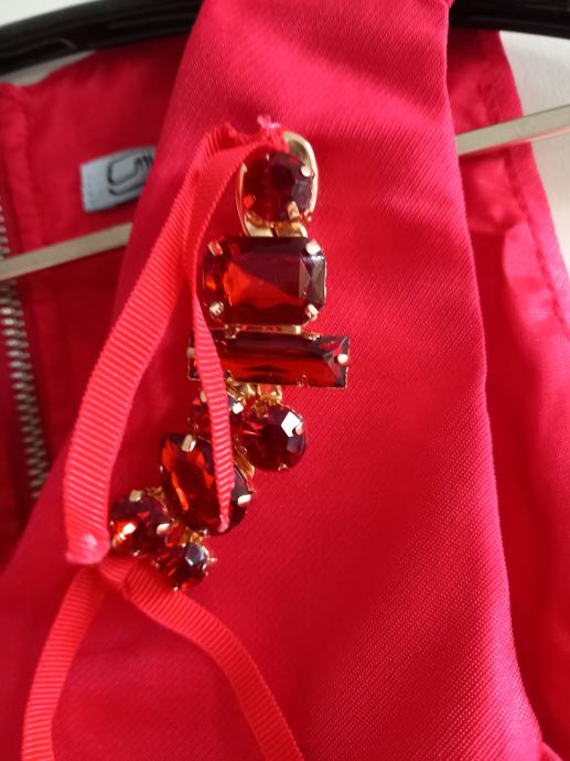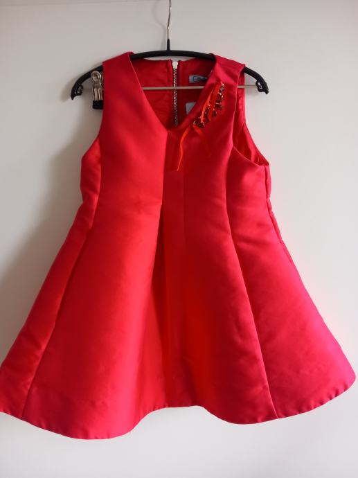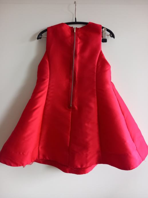 Svečana oblekica v zelo lepi rdeči barvi, primerna za starost 6 let oz. mere prsnega obsega 63 cm, dolžina oblekice 55 cm. Zadaj na oblekici zadrga, spredaj kot dekoracija biserčki. Oblika na zvonček, spodaj podloga z okrasom čipke.