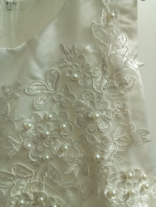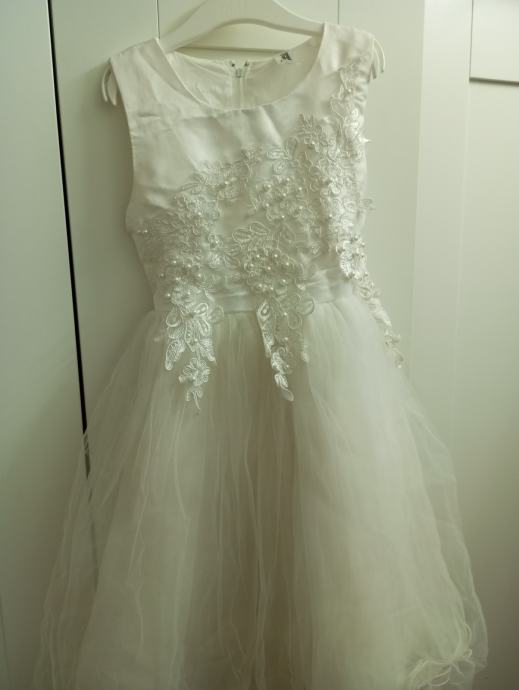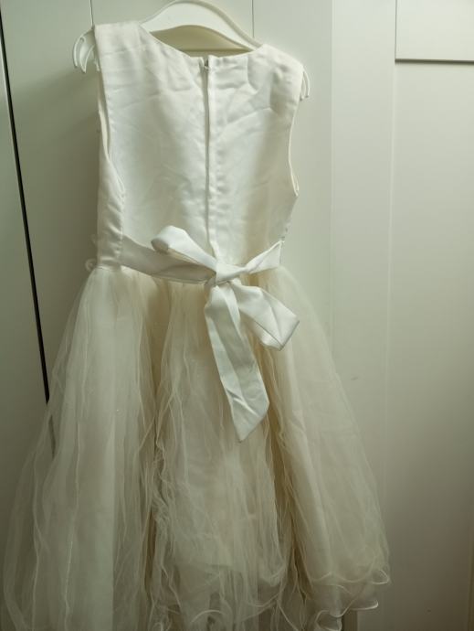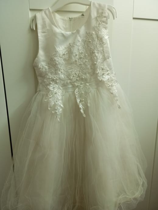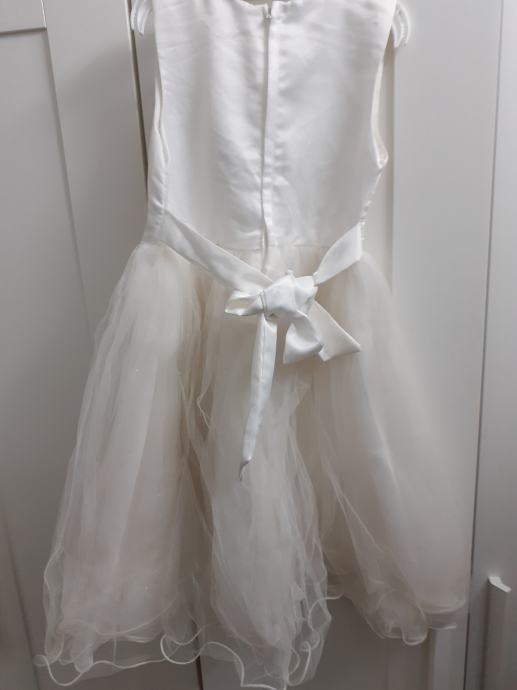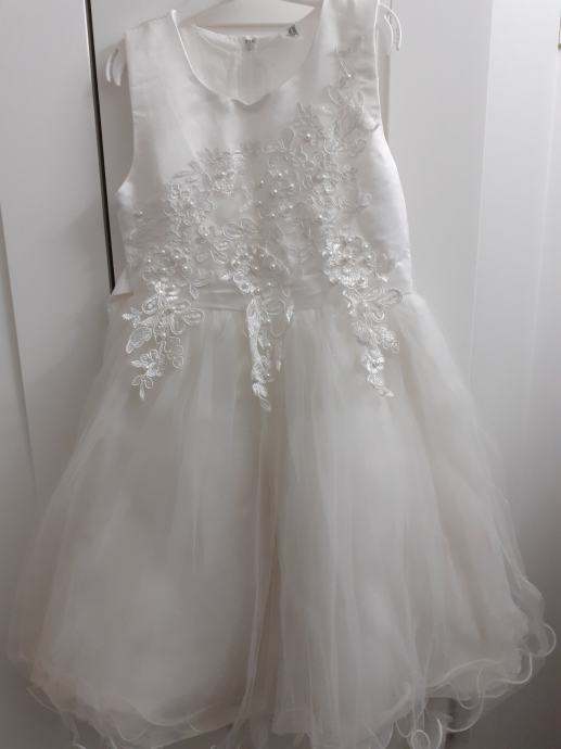 Prodam svečano belo obleko za punčko v številki 122/128. Za poroke, obhajilo, posebne priložnosti. Dolžina obleke je ca.65 cm .