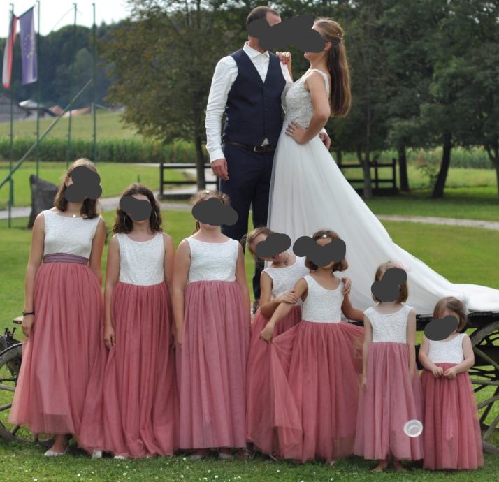Prodam prekrasne obleke za družice, ki so bile nošene na poroki. Primerne so tudi za birmo, valeto, maturo, gledališče, opero ali druge svečane priložnosti. Za dekleta višine cca 135 cm do 170 cm.