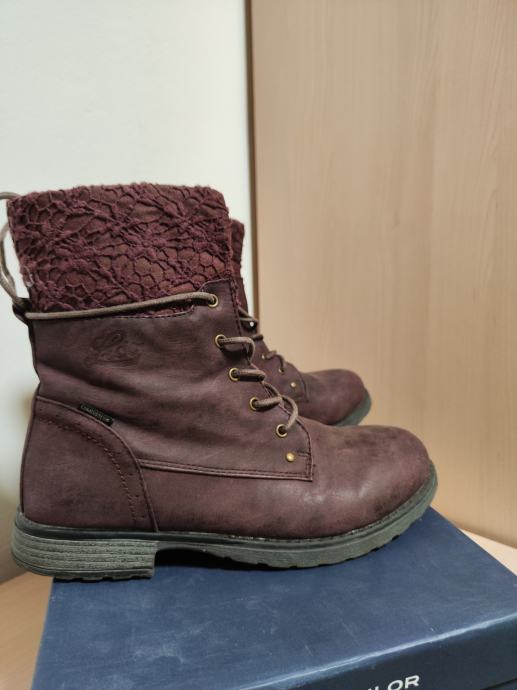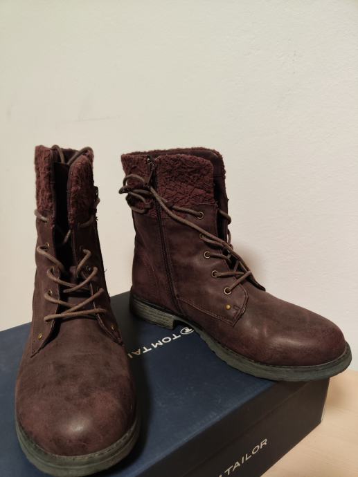 Visoki, jesensko -zimski čevlji,vijolični odtenek, št 38, spredaj se regulirajo z vezalkami, na notranji strani zadrga, notranjost topla