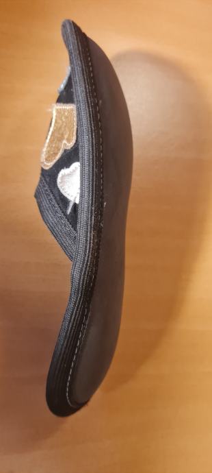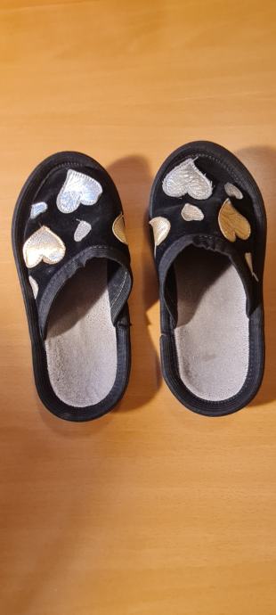 Prodam dekliške brodi usnjene sobne copate črne barve z belimi in zlatimi srčki.