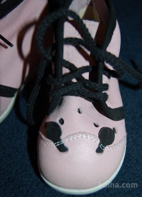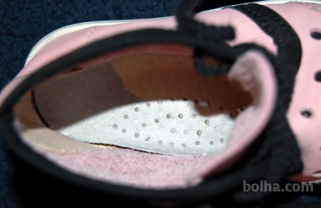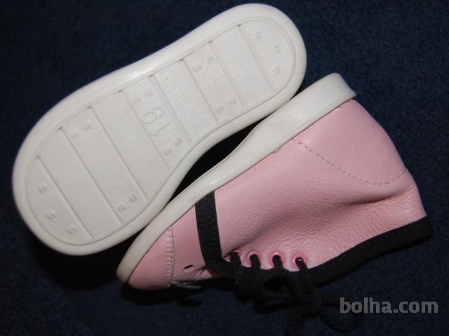Čisto novi dekliški čevlji (hčerka pri tej številki še ni shodila) iz mehkega usnja nežno roza barve s črnimi lepotnimi detajli, tudi notranjost je usnjena. Zelo simpatičnega videza, notranja dolžina 12 cm.