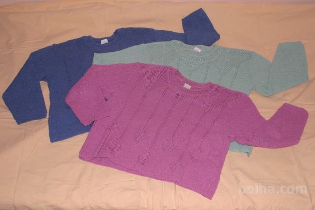 Prodajam 3 puloverje za deklice. Starost ca.11 let. Mislim, da sploh še niso bili nošeni. So enaki, le po barvi se razlikujejo. Izdelani na Madžarskem, izgledajo pa kot bi bili kvačkani. Navedena cena je za posamezen kos.