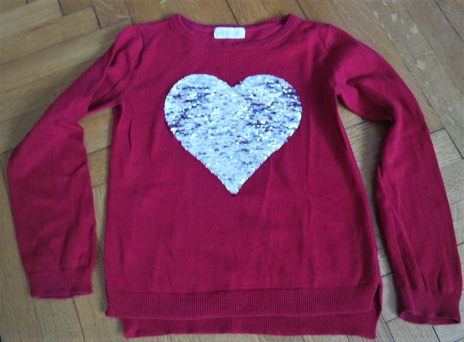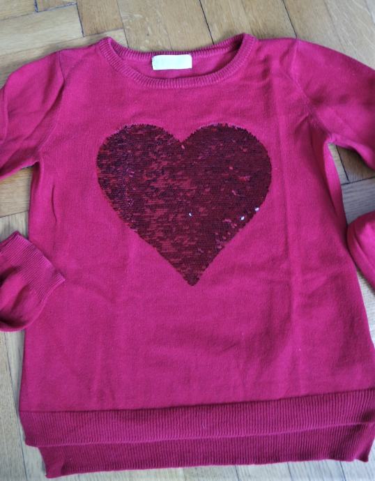 Dobro ohranjen bombažni tanjši pulover s svetlečim rdečim ali srebrnim srčkom, lepe rdeče barve - na fotografijah ni prave rdeče barve.