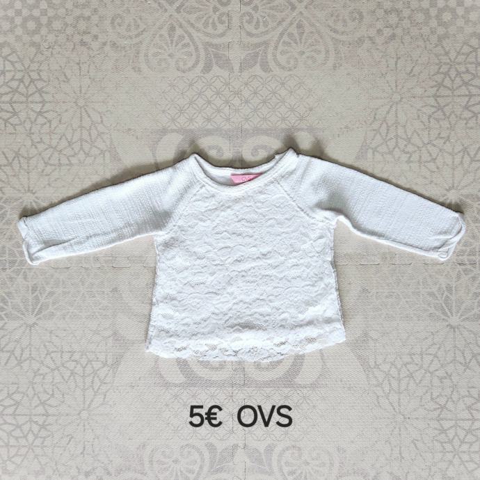 Prodam OVS pulover, bele barve s čipko, velikosti 98. V primeru pošiljanja, navadno blagovno pošiljanje 1,2€. Prevzem možen v Ljubljani.