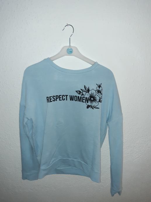 2. Svetlo moder pulover z črnim napisom RESPECT WOMEN, iz kolekcije pimkie, za dekleta 11-13 let, cena - 2€