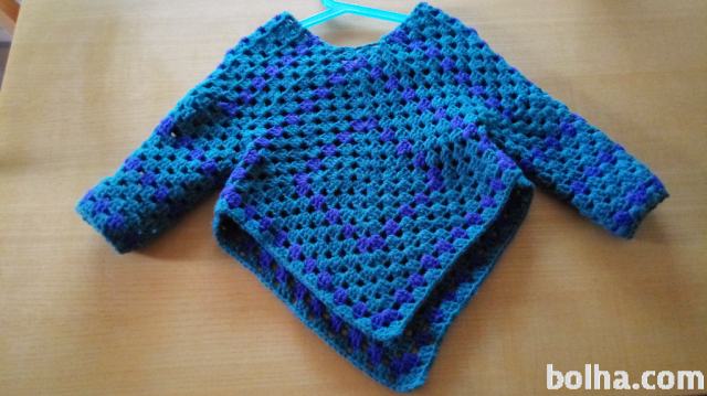 Prodam unikatno (ročno) nakvačkan pulover, v modrih odtenkih barve, nenošen, primeren tako za dečke kot za deklice, za starost 4-5 let. Dolžina rokavov od ramena je 37 cm, dolžina puloverja je cca 52 cm, obseg v pasu je 54 cm. Nakvačkan je iz volne NIKA.