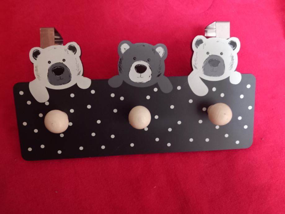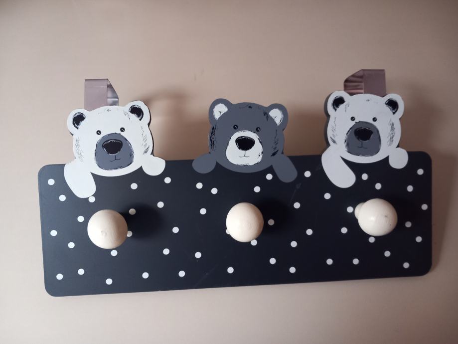 Lesen otroški obešalnik na 3 kljukice, trije medvedki, vel. 30 × 15, rabljen a brez poškodb. Vaš malček bo z veseljem obešal svoja oblačila. Mogoča dostava Ljubljana, Celje, ali obala. Lepo darilo za decemberske dobre može.