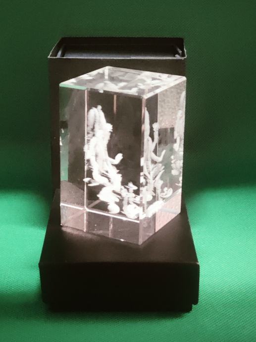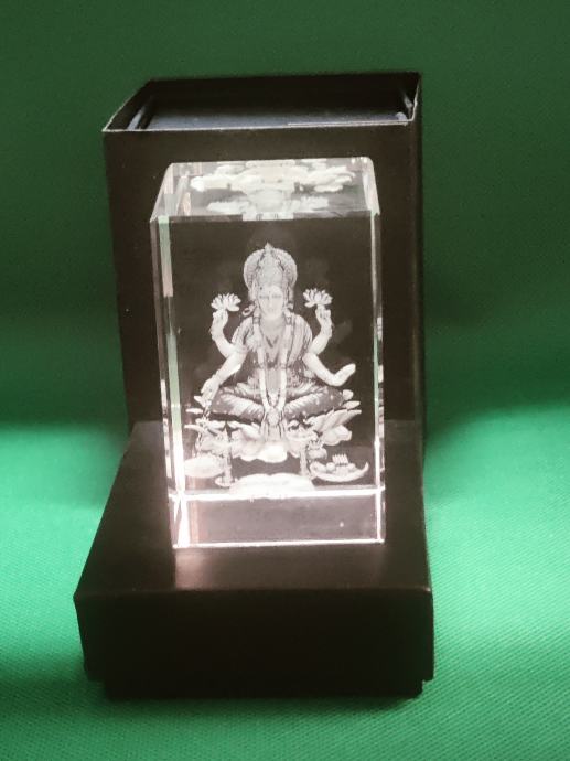 Indijska boginja sreče Lakšmi, ki jo častijo vsi jogiji po svetu saj prinaša srečo in blagostanje je vgravirana 3d v kristalni kvader 80x50x50mm prodam za 35 eu