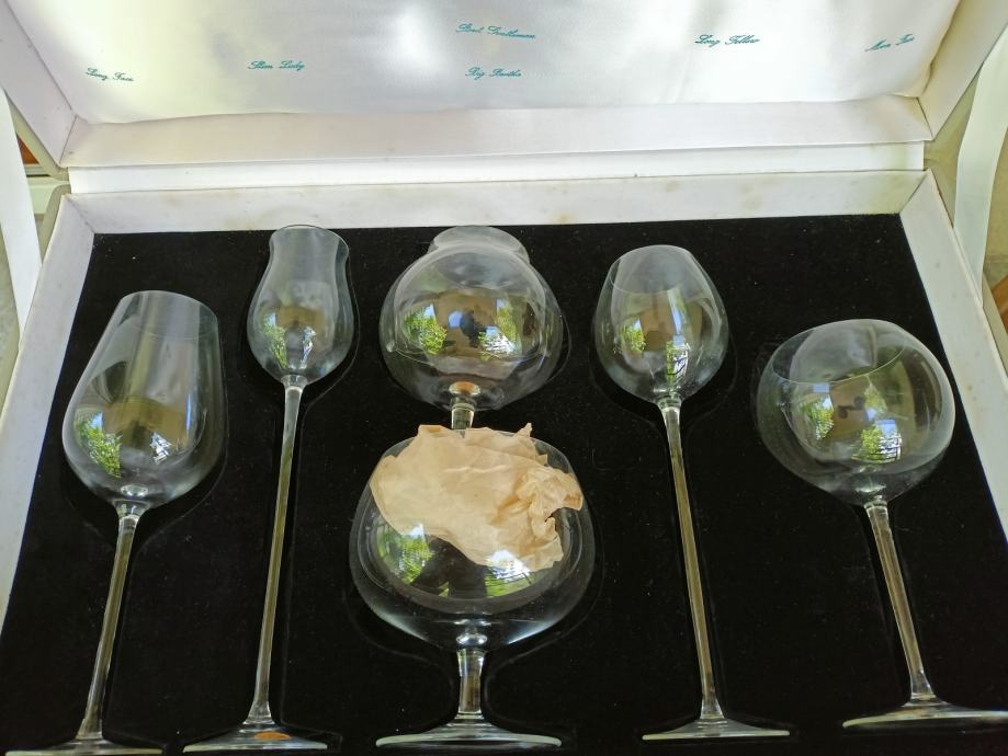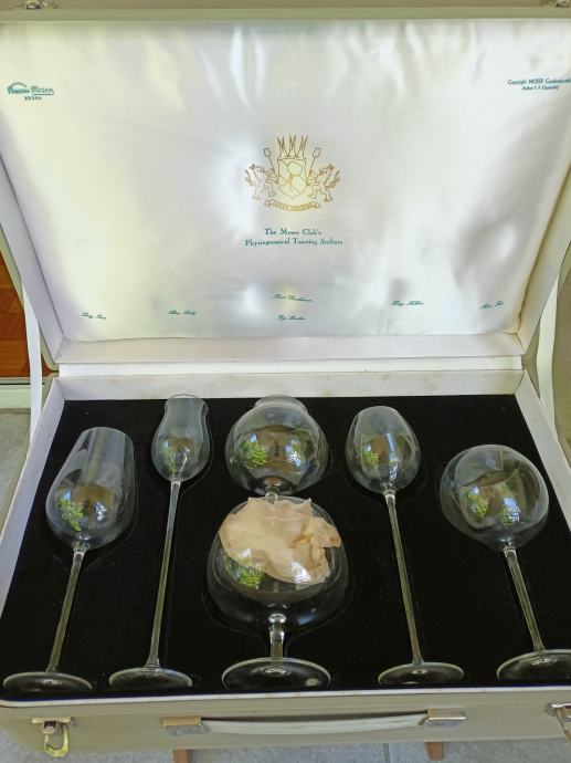 Ekskluzivni Moser Club's Physiognomical Toasting Snifters Glass Set Moser-Karlsbad, steklo, oblikovanje F.P. Chocholaty, 1957, v originalni škatli Kovček: 53 x 34 x 16 cm Imena kozarcev: Slim Lady, Long Face, Stount Gentlemen, Big Bertha, Moon Face in Long Fellow; Stanje: kovček starostno-obrabljen, steklo kot novo, zelo dobro ohranjeno-nerabljeno.