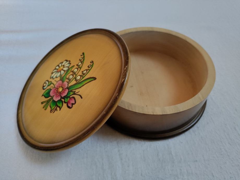 Lesena ročno izdelana šatuljica z rožastim vzorcem, vintage