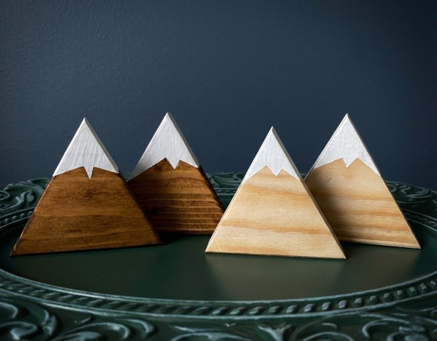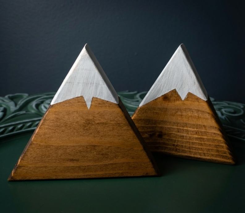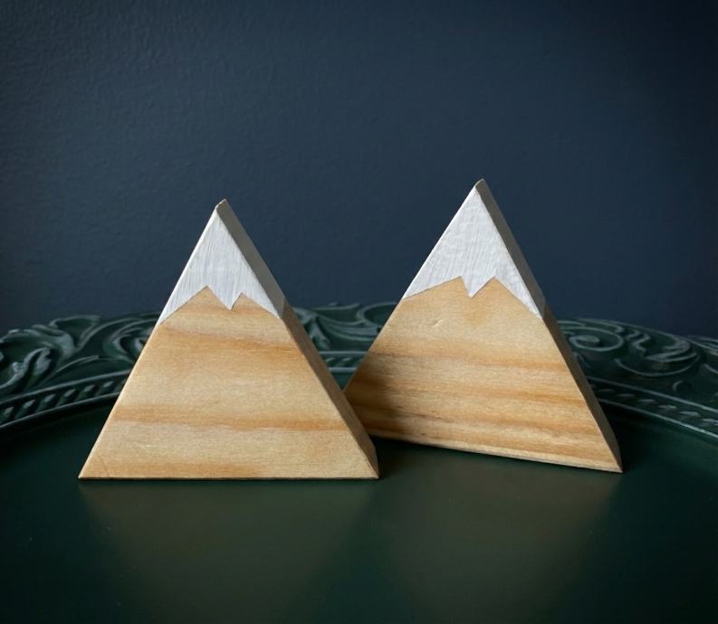 Na prodaj so estetski leseni okrasni trikotniki z motivom gora v kompletu po 2 kosa (temni ali svetli). Primerni za dekoracijo doma, pisarne ali kot darilo. Izdelki so minimalistični, umirjeni in se lepo podajo tako v sodobne kot tudi rustikalne interierje.