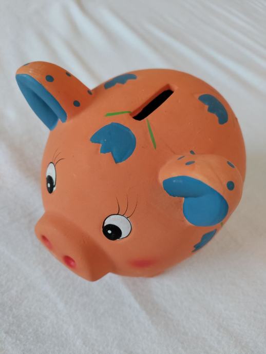 Glinen šparovec v obliki pujsa, oranžne barve, s pokrovčkom na dnu. Gratis plastični šparovec v obliki pikapolonice, plastičen, rdeč.