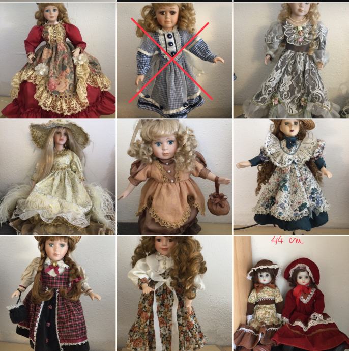 Prodam okrasne punčke. Okvirna cena posamezne je 10€, več skupaj pa po dogovoru za manj. Višina vsake je napisana na sliki. Peta po vrsti, s torbico na roki, se navije in rahlo premika naprej in nazaj, ob tem pa se igra skladba. Prečrtana je prodana.
