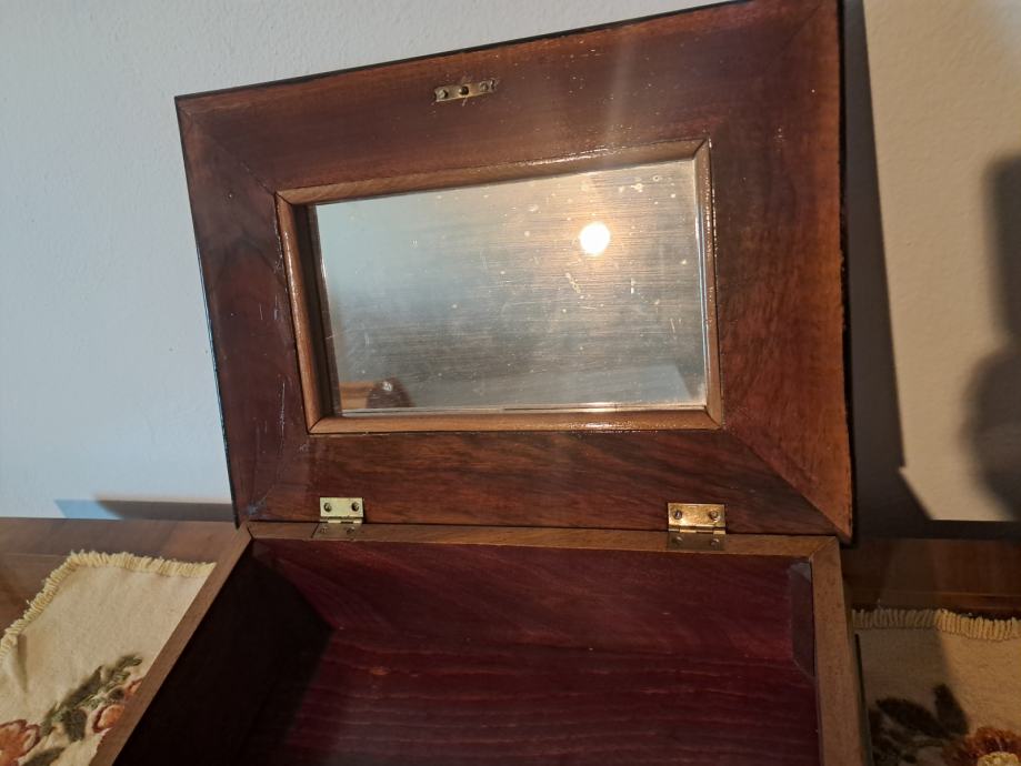 Notranjost pokrova ima vdelano majhno ogledalo – idealno za nakit, ure, pisemske spomine.