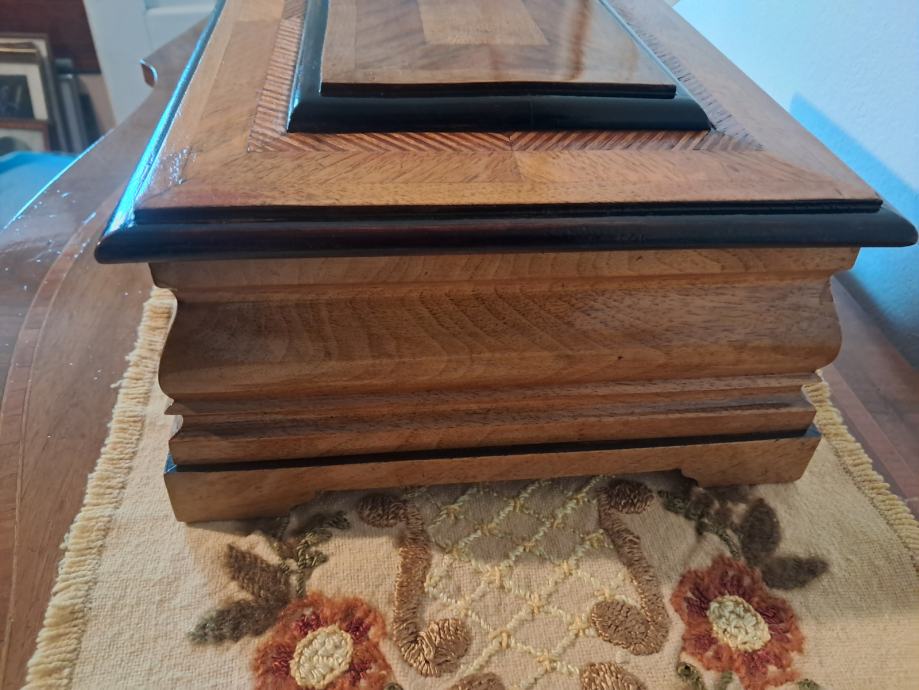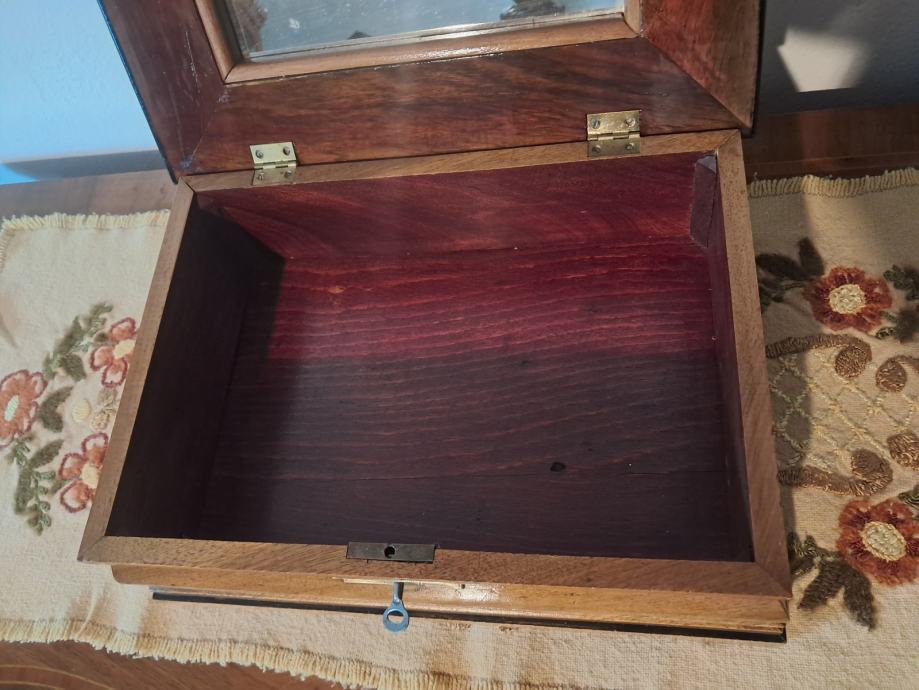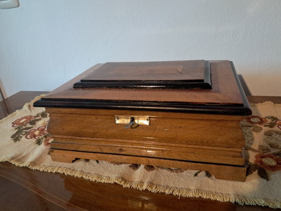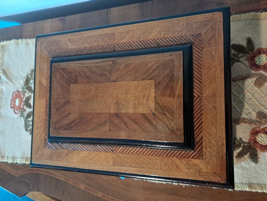 Ročno izdelana lesena šatulja iz obdobja med obema vojnama, z izjemno lepo ohranjeno geometrijsko intarzijo na pokrovu. Izdelana iz več vrst lesa (svetlejši trup, temnejši okvir), z značilnim večplastnim vzorcem, ki odraža mojstrsko obrtno tradicijo pozne secesije in zgodnjega art decoja.