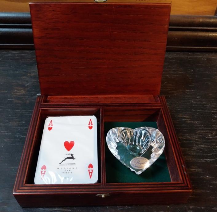 Darilni set, lepa lesena šatulja 17 x 14 cm, v njej kristal srce 7 x 6 cm, višina 3 cm, izdelovalec Steklarna Rogaška, lahko za svečnik, ali za odlaganje verižice, prstana... Zraven še karte za igranje, vse nerabljeno. Za 2 eura lahko pošljem tudi po pošti.