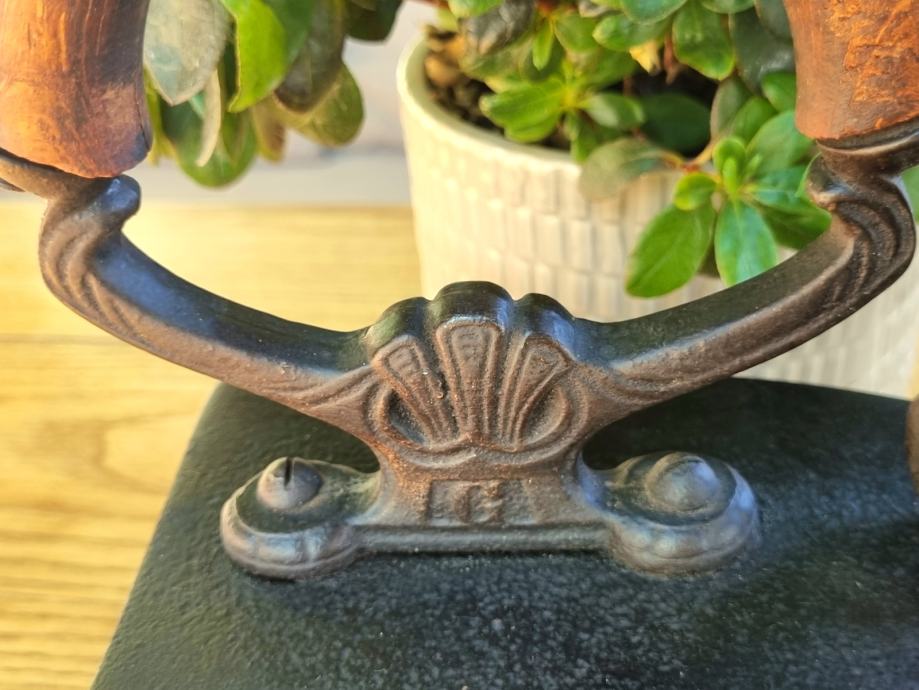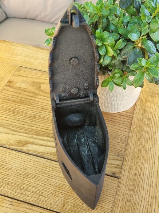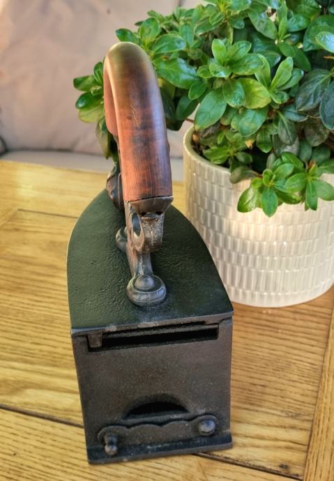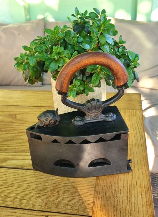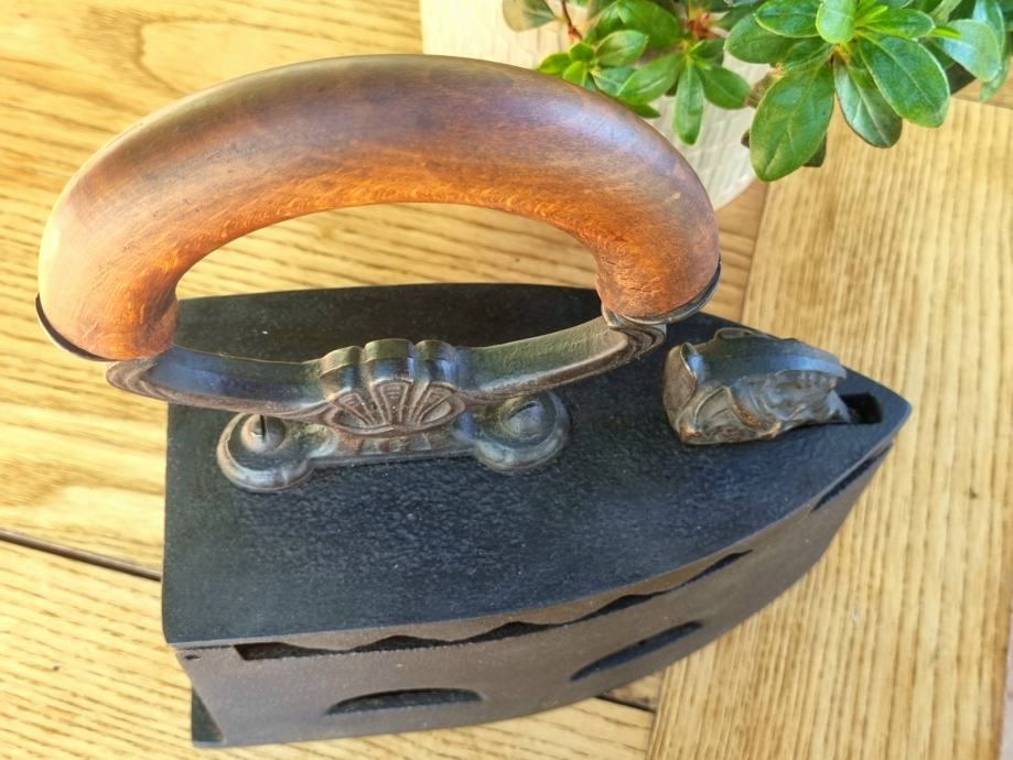 Zelo dekorativen likalnik na oglje s konca 19. oziroma začetka 20. stoletja, očiščen, speskan, zaščiten, z umetelno oblikovanim ročajem in glavo sfinge na prednji strani. Zbirateljski kos.