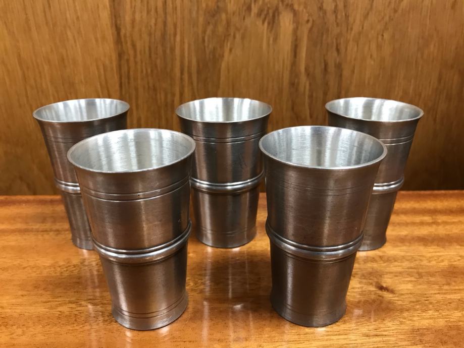 Na voljo servis sedmih posod (največjih dveh ni na fotografiji) in petih kozarčkov izdelanih iz kositra.
