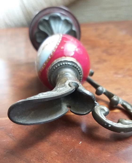 Material mesing, steklo(keramika?), skupna višina 14,5 cm. Lepo ohranjena.