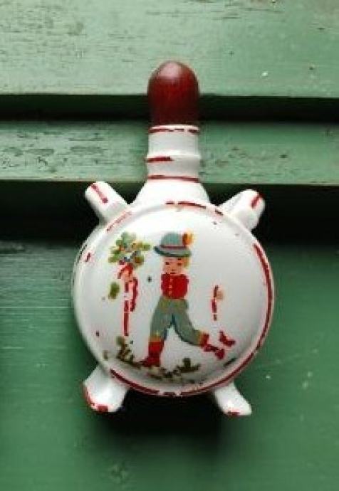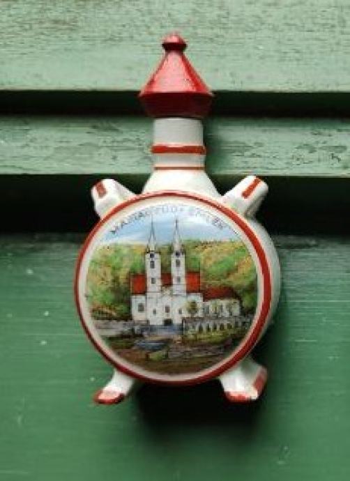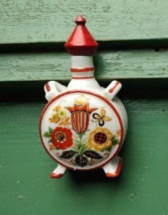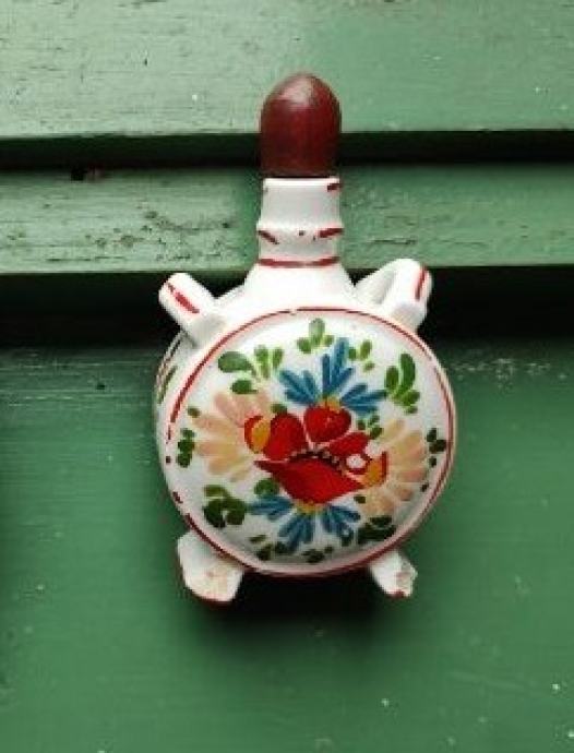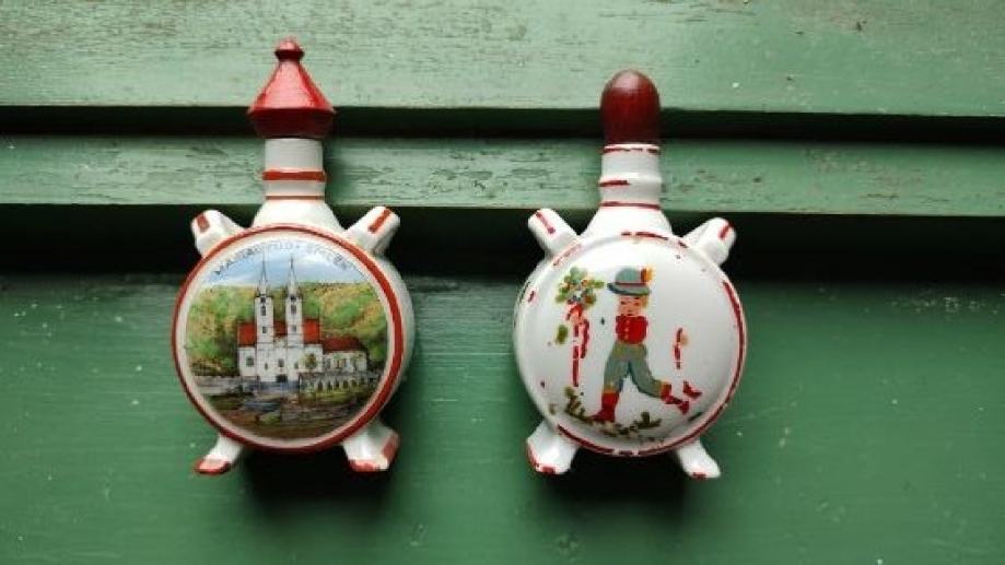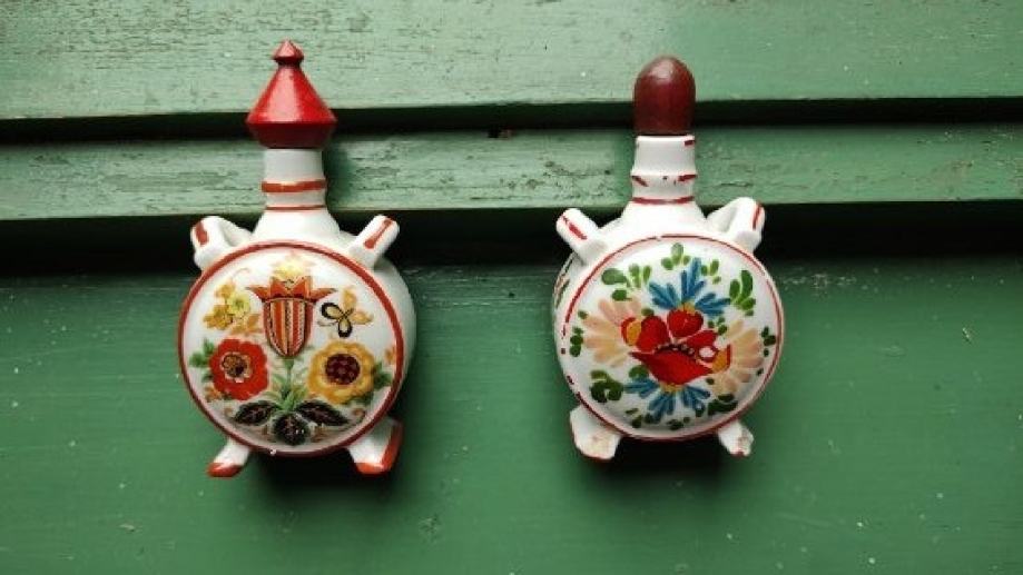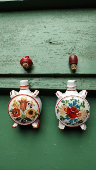 DVE PORCELANASTI STEKLENIČKI V OBLIKI ČUTARIC, Z LEPO POSLIKAVO Z OBEH STRANI. SPOMINKA IZ MADŽARSKE.