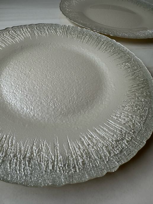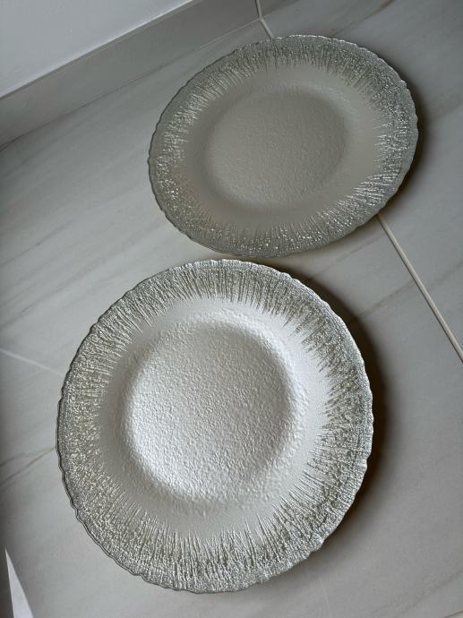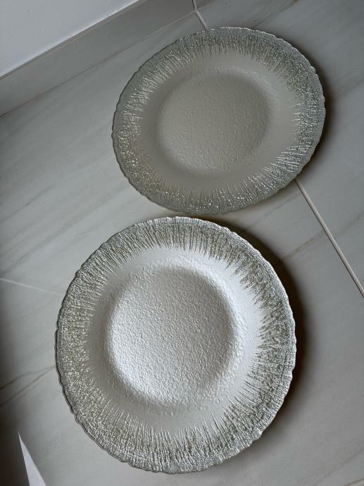 Zelo lepo ohranjena, malo rabljena steklena rahlo svečana okrasna krožnika, srebrno-zlate barve. Kontakt: 040776670
