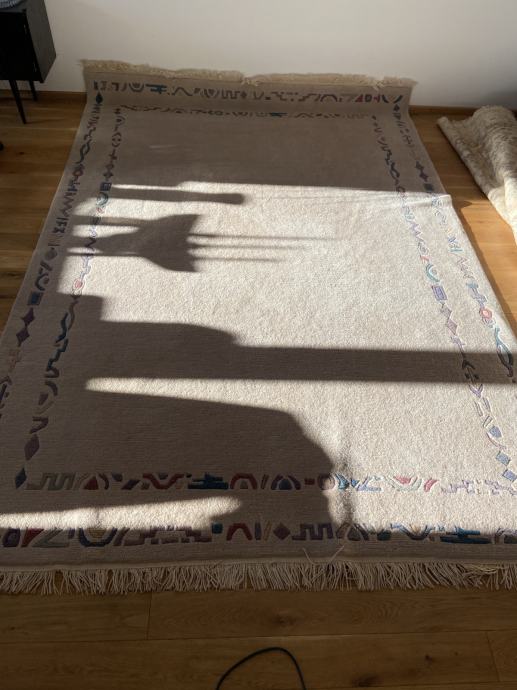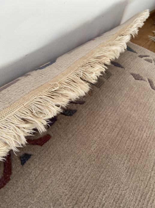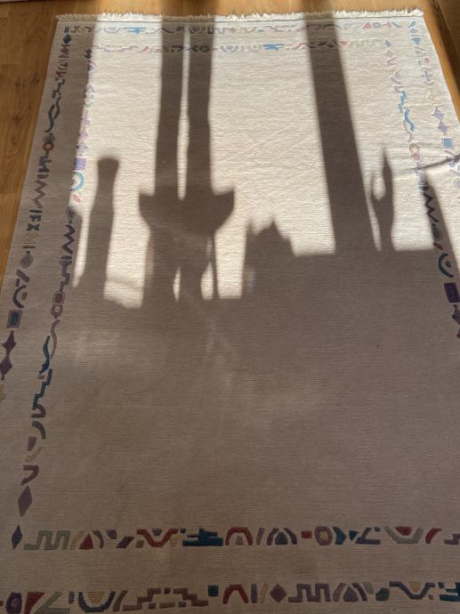 Večji Perzijski ali Turški ročno pleten tepih iz 1980. Tepih je bež barve z dekorativnimi mavričnimi vzorci in resicami in meri 200 x 300 cm.