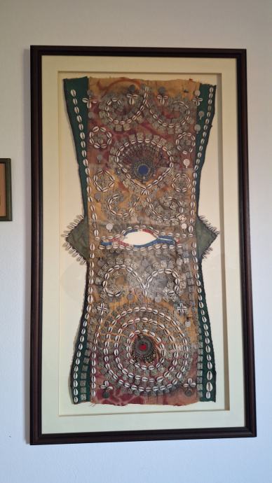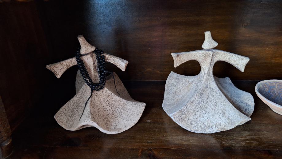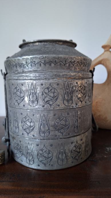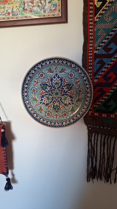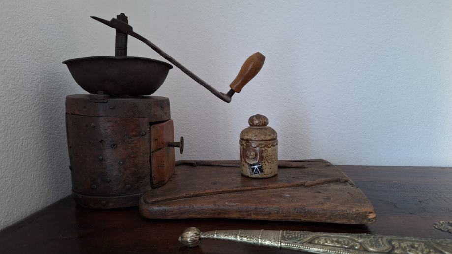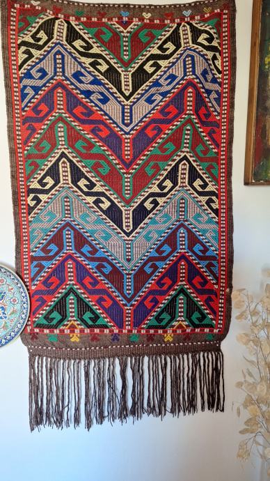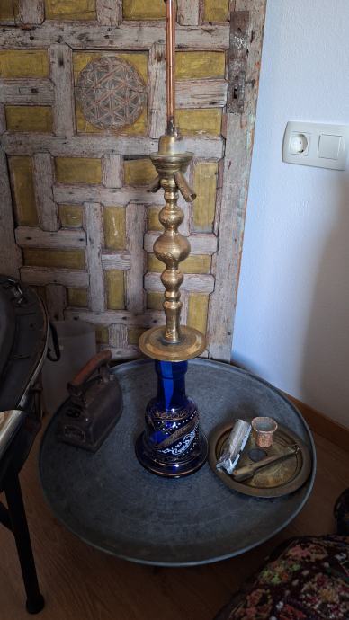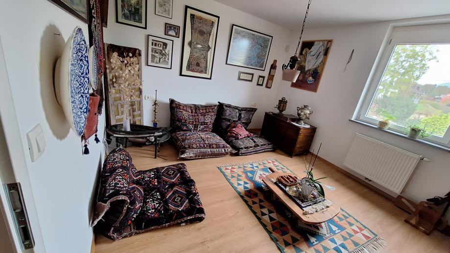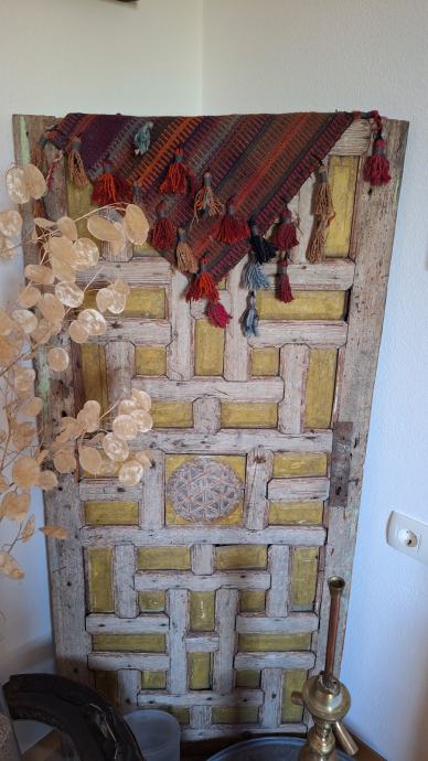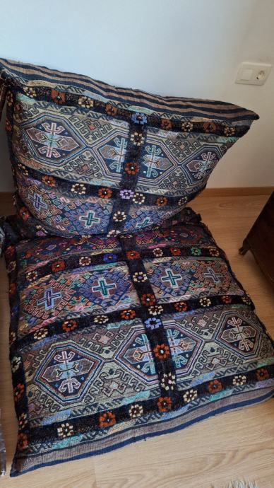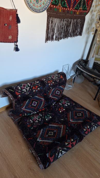Zbirka turških predmetov: vreče za sedenje, mizica, stensko okrasje, stara vrata, skrinja, šiša in 2 omari.