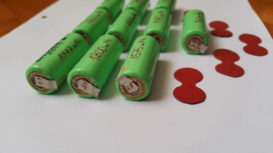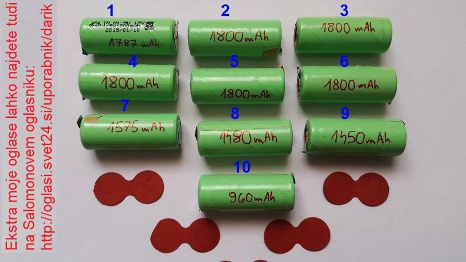Prodam 10 rabljenih NiMH 1,2 V 1800 mAh baterij industrijskega standarda 4/5A. Imam jih ene par let in imel sem jih za napajanje enega 12V alarmnega sistema. Lahko se jih uporabi tudi kot nadomestne v modelarstvu, navigacijskih napravah, vijačnikih (mogoče), za napajanje Arduino (nano) modulov, ipd. Vse imajo praktično gor še svoje prvotne lotne jezičke kar je dodaten plus. Zraven dodam tudi še ta preostala negorljiva papirnata pokrivala oz. izolatorje.