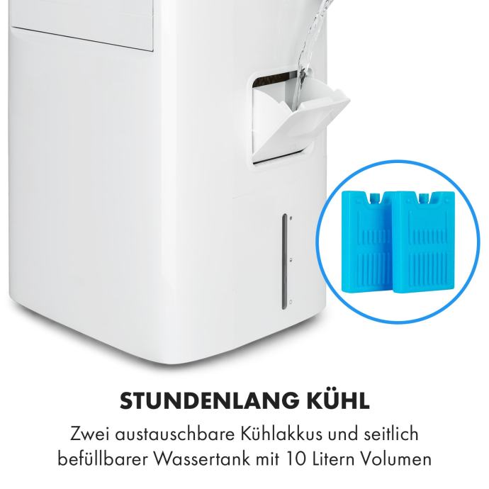 * 4 v 1 efektivnost: ventilator, ohlajevalnik zraka,čistilec zraka in vlažilec v enem * Hladna sapa: štirje nivoji zmogljivosti za petok zraka za do 384 m³/uro * Hlajenje vode: hladi preto zraka za do 3 °C s pomočjo izparevanja vode * Hladi cele ure: dva nadomestna hladilna akumulatorja in bočna posoda za vodo s prostornino 10 litrov * Vlažilec zraka: izpari do 1100 ml vode na uro - idealen proti suhemu zraku pri ogrevanju pozimi * Varčen: poraba samo 68 W pri neprekinjenem obratovanju * Veter v vsakem vogalu: samostojni preklop, avtomatska vertikalna in horizontalna oscilacija * Individualna osvežitev: s 3 režimi obratovanja in 4 hitrostmi vetra * Intuitivno upravljanje: s pomočjo razumljivih tipk, LED luči ali s pomočjo daljinca * Čisti zrak: vgrajen ionizator za čiščenje zraka
