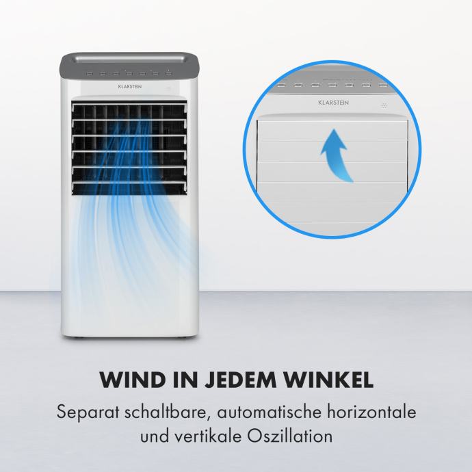 Štirikratno dober: ohlajevalnik zraka Klarstein Coldplayer nudi najboljšo klimo z efektivnostjo 4 v 1 kot ventilator, ohlajevalnik zraka, čistilec zraka in vlažilec zraka. Hladna svežina, ki je vredna.Zahvaljujoč visokemu pretoku zraka 384 m³/uro razgiblje naprava Klarstein Coldplayer kot ventilator poletni zrak in ustvarja prijetno sapo v štirih hitrostih. V kombinaciji s funkcijo ohlajevalnika zraka je pretok zraka prijetno ohlajen in nudi osvežitev. Naprava Coldplayer poleg tega obogati zrak v prostoru za do 1100 ml prijetne vlage na uro, zato je praktičen pomočnik pozimi, ko doda suhemu zraku vlago. Takrat voda izpari iz 10 - litrske posode čez voščeni filter. To izparevanje odvaja temperaturo iz pretoka zraka na naraven in energetsko varčen način - zrak postane prijetno hladen in osvežilen, za mizo, na sedežni ali v postelji. V primeru potrebe znižujeta temperaturo za še boljšo osvežitev dva nadomestna hladilna akumulatorja v posodo za vodo. Posoda je premična, da je bolj enostavno njeno polnjenje, čiščenje in praznjenje. Če se mora osvežiti več kot samo ena oseba, se lahko samostojno aktivira vertikalna in horizontalna oscilacija, da se omogoči gibanje zraka. Zadnja funkcija, ki se lahko aktivira, je ionizator. Ta obogati zrak z ioni, ki omogočajo usedanje umazanije in povročajo njeno zmanjševanje. Zahvaljujoč vgrajenim kolesom se lahko 4 v 1 ohlajevalnik prostora Klarstein Coldplayer prenese kamorkoli in je takoj pripravljen za uporabo.Zmogljivi in vsestranski: zračni ohlajevalnik zraka Klarstein Coldpplayer je osvežilni odgovor na vse vroče dneve v letu.