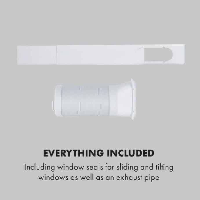 * 1 x klima * 1 x daljinski upravljalnik, vključno z baterijami * 1 x tesnilni set za pomično okno * 1 x tesnilni set za izklopno okno * 1 x odvodna cev * Navodilo za uporabo v nemščini (drugi jeziki: angleški)