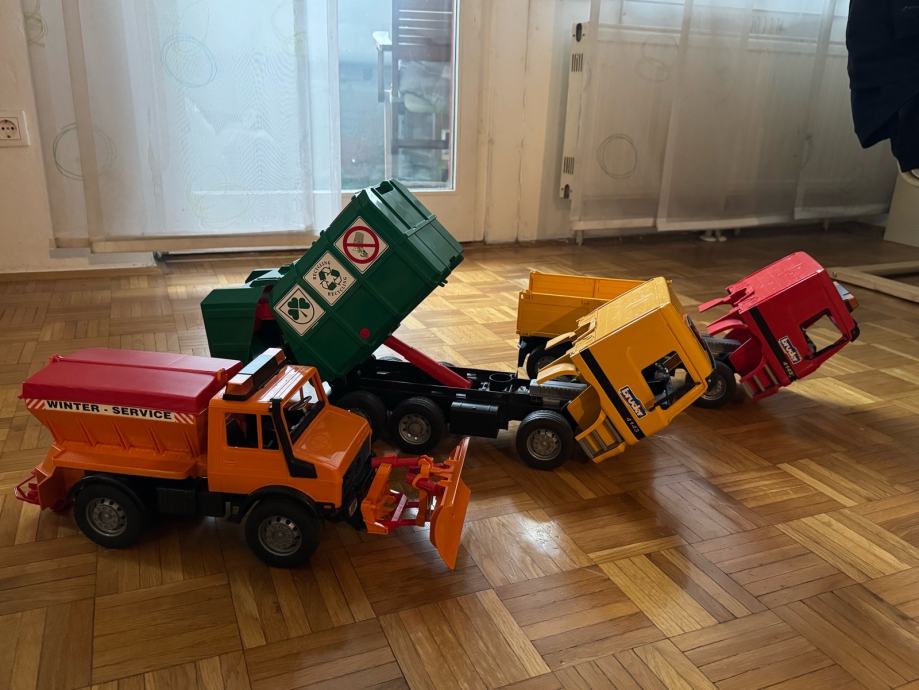 Prodam pet delovnih vozil (smetarski tovornjak, plužilec, “kiper”, avtovleka, traktor), lahko vsakega posebej (15€) ali v kompletu (70€). Kot na sliki.