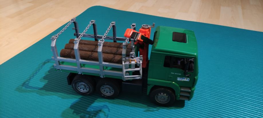 Bruder tovornjak MAN za prevoz lesa je odličen model s premišljenimi detajli. Kabina tovornjaka se lahko nagne, razkrivajoč pogled na motor. Obe stranski ogledali se lahko zložita, in stranske stene tovornjaka se dvignejo. Popolnoma funkcionalen nakladalni žerjav ima klešče za natovarjanje in raztovarjanje lesa. Tri drevesna debla so priložena.Velikost: 43,0 cm × 18,5 cm × 25,5 cm. Cena 35,00 EUR. Možna dostava v Ljubljano. Kontakt: Uroš, tel. št. 040215166.