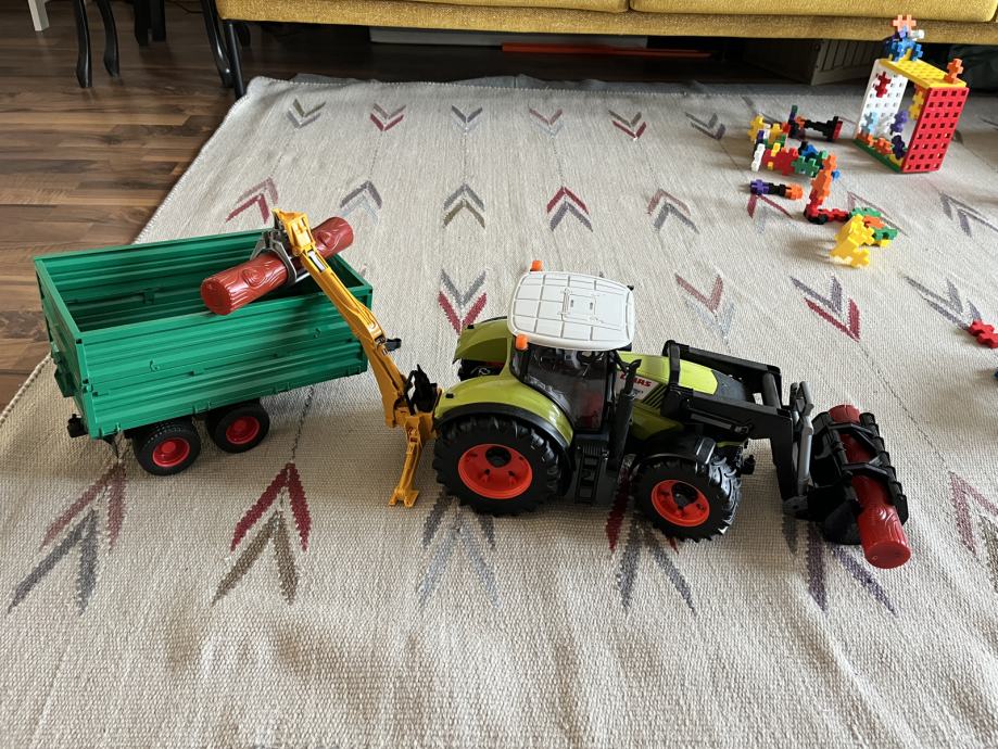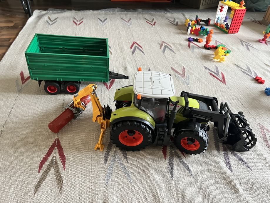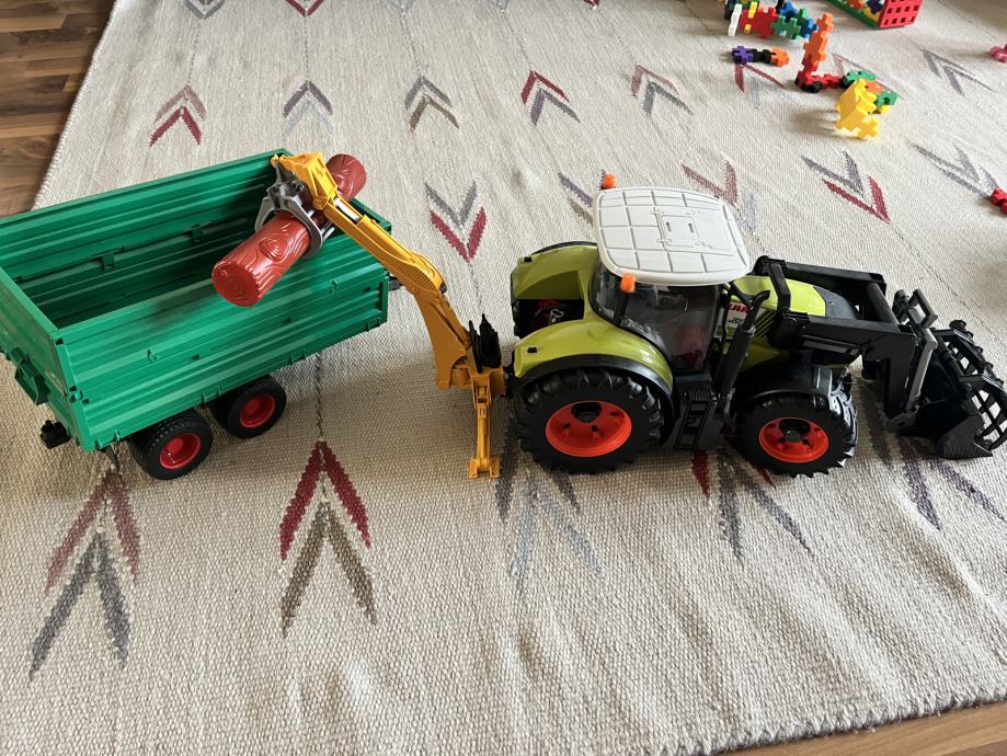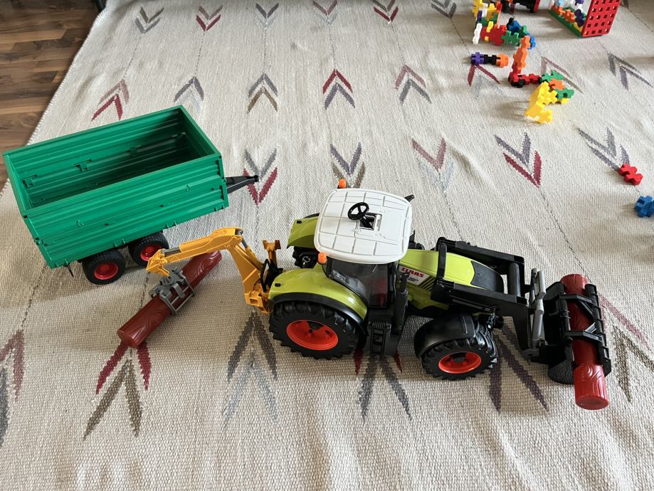 Kot nov Bruder traktor CLAAS s prednjim nakladačem, prikolico, dvižno roko in hlodi.