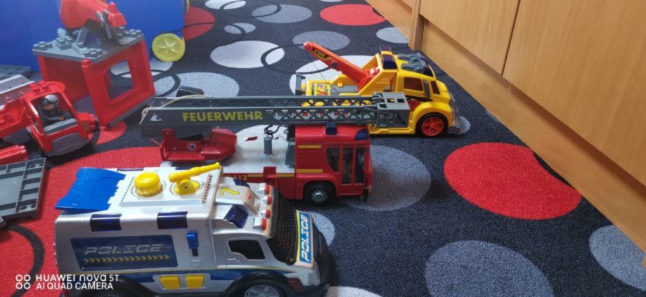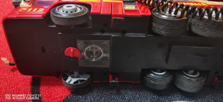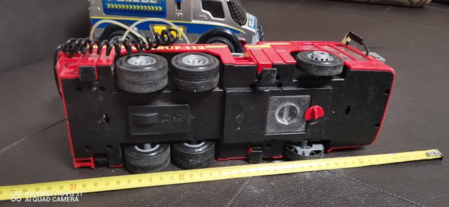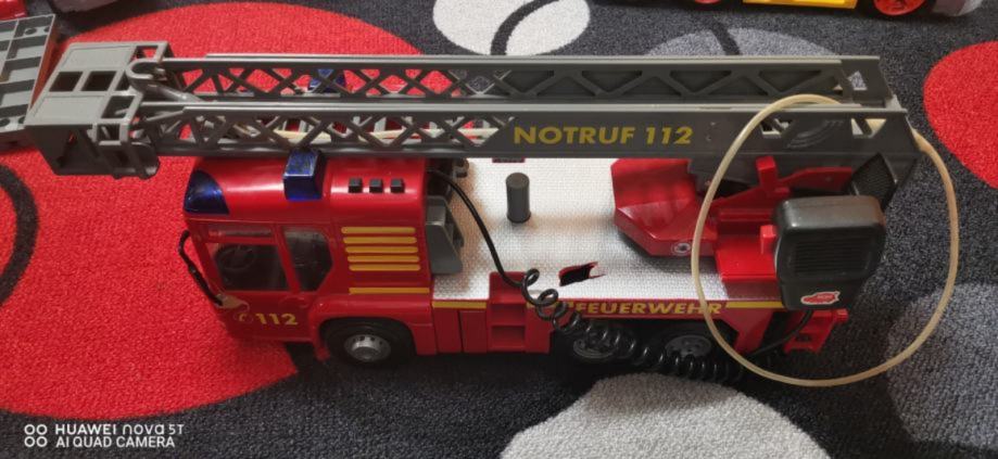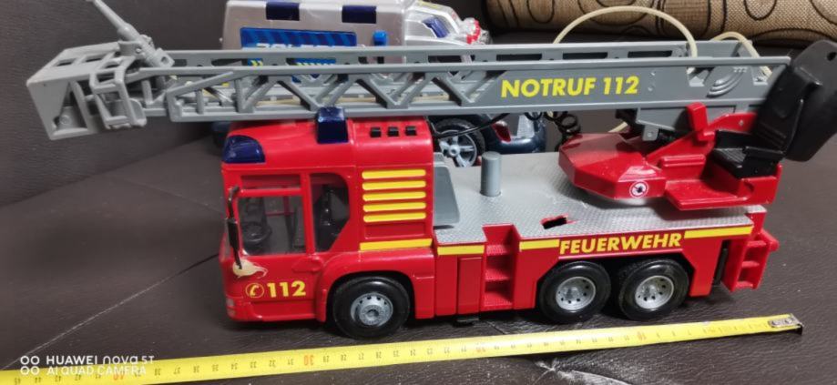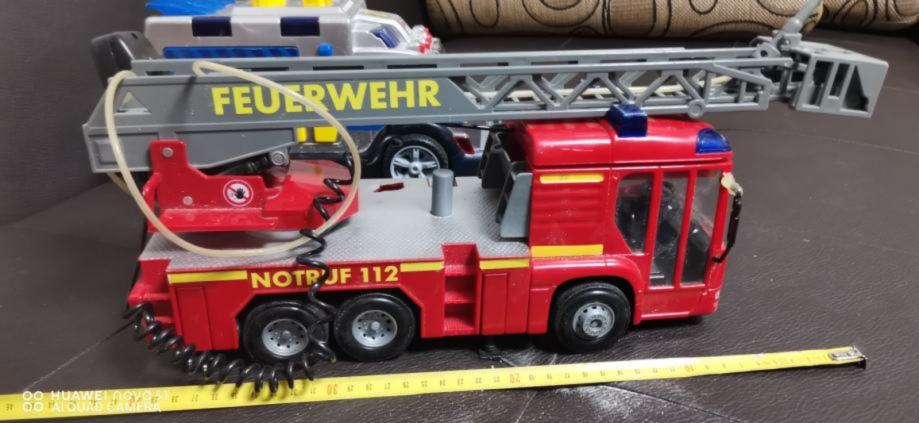 Veliko gasilsko vozilo z dolgo lestvico, delujočim megafonom in cisterno vode pod vozilom s katero šprica.