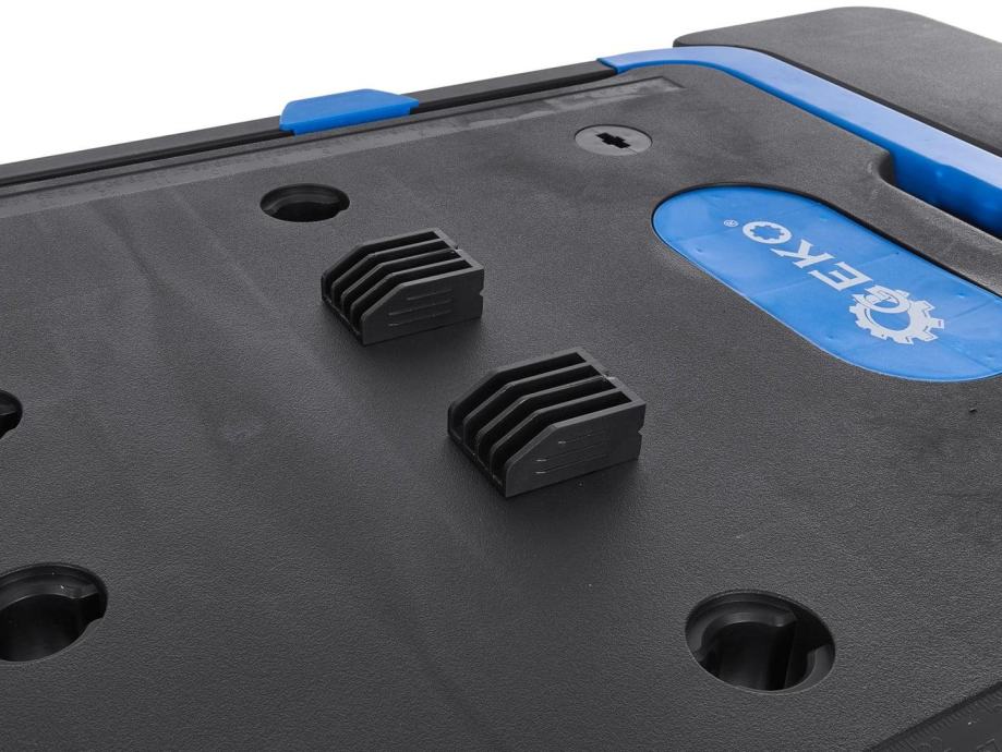 Delovna miza ima številne funkcije, ki naredijo delo veliko bolj učinkovito, vključno z: 12 luknjami, v katere lahko s posebnimi adapterji pritrdite čeljusti ali mizarske spone, reliefni kotomer in merilo s skalo v cm in inčih.